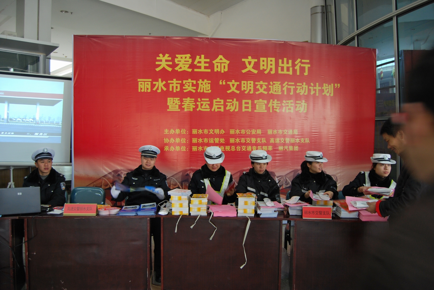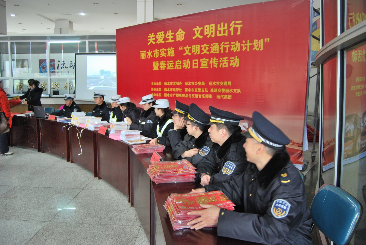 春運(yùn)首日,由麗水市文明辦、麗水市公安局、麗水市交通局主辦,麗水市運(yùn)管處、麗水市交警支隊(duì)、高速交警麗水支隊(duì)協(xié)辦,麗水電臺(tái)交通音樂(lè)頻率、麗汽集團(tuán)承辦的 關(guān)愛(ài)生命 文明出行 麗水市實(shí)施“文明交通行動(dòng)計(jì)劃”暨春運(yùn)啟動(dòng)日宣傳活動(dòng)在麗水客運(yùn)西站舉行。