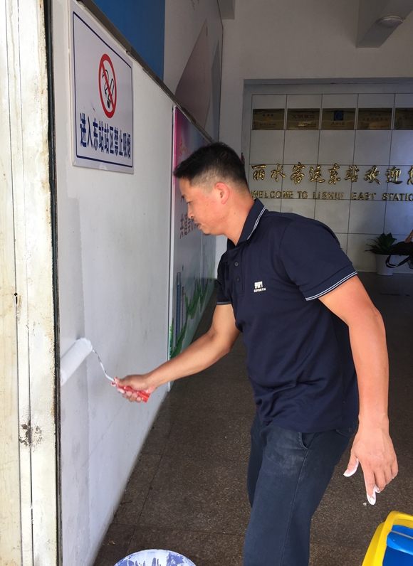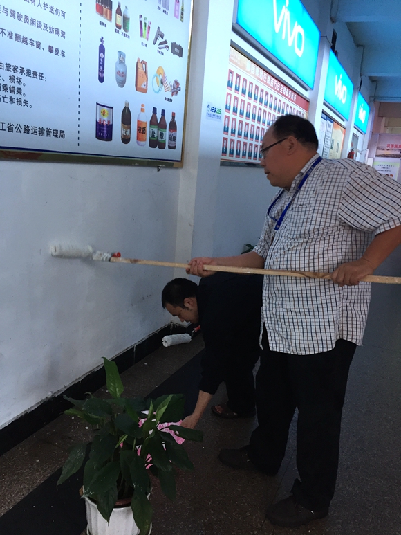東站志愿者隊售票廳、候車廳、發(fā)車區(qū)墻壁進行刷白
