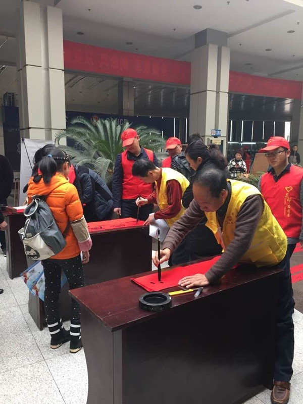 總工會的志愿服務(wù)隊(duì)伍還帶來了“志愿者書寫春聯(lián)”,現(xiàn)場寫就的200多幅春聯(lián)很快就被乘客們領(lǐng)取一空。