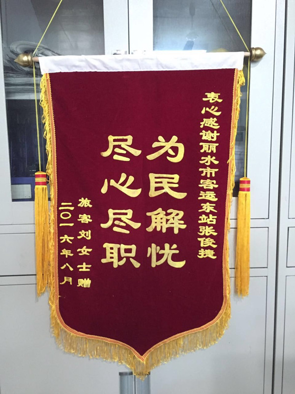 8月20日上午,一位女士將一面錦旗送到客運東站站長值班室,握著值班站長的手一個勁地道謝。錦旗上赫然寫著:“盡心盡職,為民解憂”八個醒目的大字,感謝麗水客運東站張俊捷。