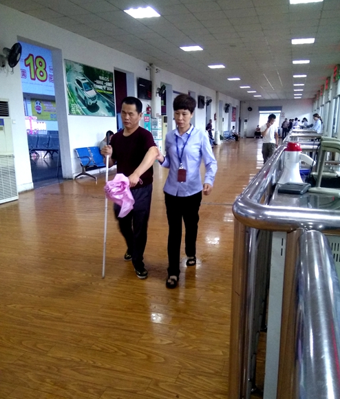 9:35到青田的車即將開始檢票,章莉走到盲人旅客跟前,準(zhǔn)備扶他提前檢票上車,這時(shí)盲人旅客不好意思的說(shuō):“我想去下廁所。”章莉說(shuō):“好的,我扶你去?!闭吕蛞恢狈鲋と寺每偷侥袔T口,因不方便進(jìn)到男廁里面,章莉就叫住了一位男旅客,叫他幫忙把盲人旅客扶進(jìn)去上廁所,自己則在男廁門口等待。好心的男旅客很爽快地答應(yīng)了,嘴里還一直夸章莉的服務(wù)好、東站的服務(wù)好。