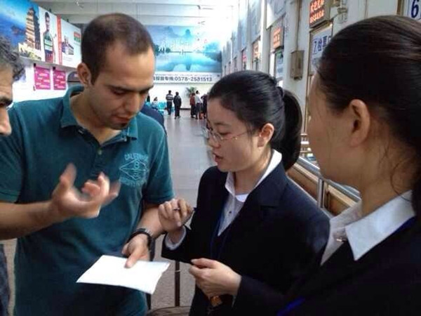 兩名外國旅客因為有要事,等不了9:40的車。經(jīng)過葉菁的一再溝通,乘客在通完一通電話后表示自己的朋友愿意開車送他們?nèi)チx烏,就不再乘車了。充當(dāng)“翻譯”的葉菁又向宣站長轉(zhuǎn)達了他們的意思,站長當(dāng)即給他們辦理了退票手續(xù),手里握著退回金額的兩名外國旅客連連道謝,念叨著:“Thank you! Thank you!"并對葉菁的熱心幫忙豎起了大拇指。
